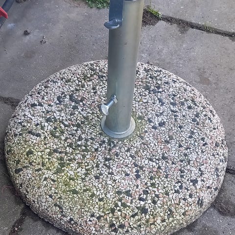 Parasolfod i halvrundt design, fremstillet i grå beton. Foden er beregnet til at stå op ad en væg eller et hegn for at spare plads og give støtte til parasolstangen. Velegnet til brug på terrasse eller altan, hvor der er behov for en stabil base til parasol. Passer til parasolrør i standardstørrelse efter mål på røret i holderen.