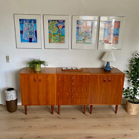 Smuk teak møbel til kontor eller stue. Brugt men velholdt. Ukendt designer; købt brugt. Sælges pga flytning.