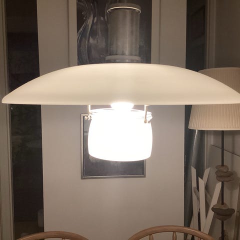 Louis Poulsen PH pendel designet af Poul Henningsen. Loftlampen er udført i hvidt metal med flerskærmssystem, der giver et blændfrit og nedadrettet lys. Egnet som belysning over spisebord, i køkken eller andre opholdsrum. Ophængt i ledning fra loftet.