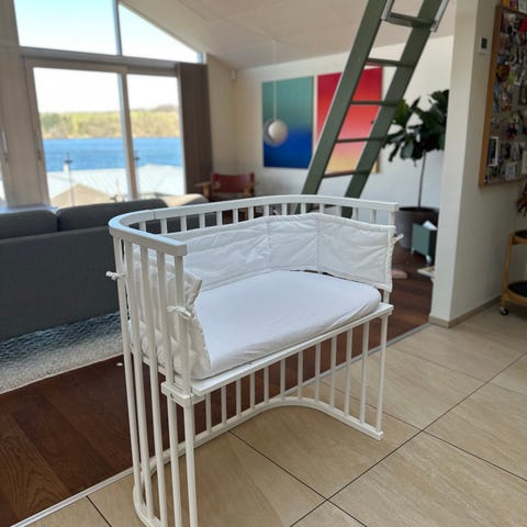 Babybay Boxspring bedside crib i hvidlakeret træ. Sengen er designet til placering ved siden af forældresengen og kan fastgøres med medfølgende stropper og beslag. Liggefladen er højdejusterbar, så den kan tilpasses forskellige sengemodeller. Der medfølger madras samt monteringsvejledning. Velegnet til spædbørn fra 0 måneder og op til den angivne vægtgrænse i producentens specifikationer.