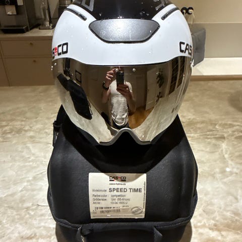 Casco Speed Time cykelhjelm med integreret spejlvisir. Hjelmen har justerbar hagerem med kliklås og ventilationsåbninger bagtil. Leveres med hård opbevarings- og transportboks som vist på billederne. Perfekt til triathlon. Str. 55-61 cm. Helt ny!