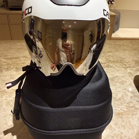 Casco Speed Time cykelhjelm med integreret spejlvisir. Hjelmen har justerbar hagerem med kliklås og ventilationsåbninger bagtil. Leveres med hård opbevarings- og transportboks som vist på billederne. Perfekt til triathlon. Str. 55-6 cm. Helt ny!