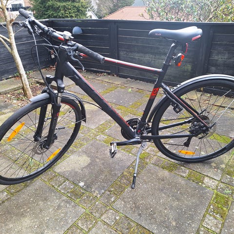 Scott hybridcykel (herre) med stelstørrelse M og 28" (700c) hjul. Cyklen er udstyret med skærme, bagagebærer og støtteben. Velegnet til hverdagscykling og pendling på både korte og længere ture. Cyklen kører godt, men trænger til nye dæk, så den kan køre helt perfekt.