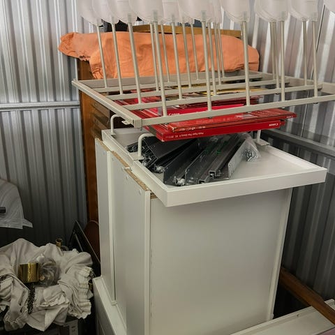 Skostativ, udtrækkeligt til et 100 cm (bredde) x 58 cm (dybde) IKEA Pax skab. Der er plads til 16 par sko på stativet. Bøjlestang til samme skabsbrede kan følge med i prisen.