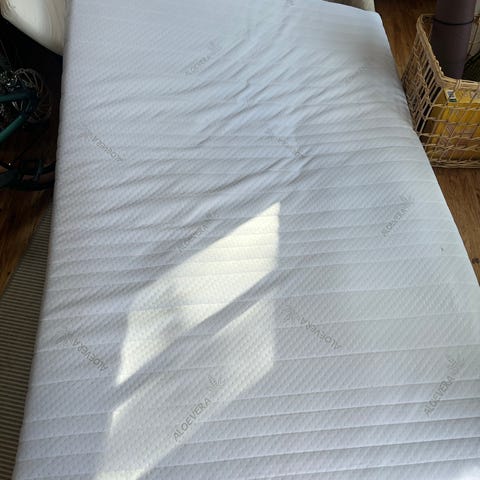 Seng med madras i størrelsen 140x200 cm.