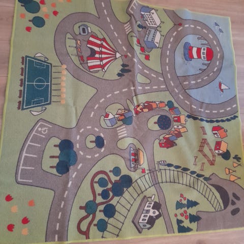 IKEA børnetæppe i rektangulær form med blå bund og cirkelmønster i forskellige blå og grønne nuancer. Egnet til børneværelse eller legeområde som blødt underlag på gulvet.