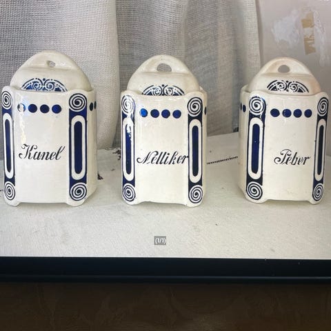 Porcelænssæt bestående af flere små lågkrukker og en skål i matchende design. Delene er dekoreret i blå og hvid med blomsterlignende mønster og guldfarvede detaljer på kanter og lågknopper. Sættet omfatter også flere guldfarvede skeer, der kan bruges sammen med krukkerne. Velegnet til servering af fx krydderier, salt, sukker eller små snacks på bordet eller som dekorativt indslag i køkken eller spisestue. Grundet flytning sætter vi en god pris på disse smukke ting.