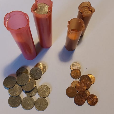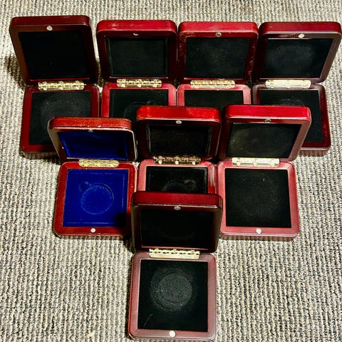 Møntkassetter i mahognifarvet æske