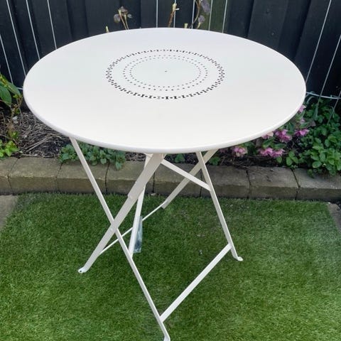 Rundt havebord i metal i Fuchsia farve. Bordet har en cirkulær bordplade med perforeret mønster i midten. Det står på sammenklappelige metalben, som gør det nemt at flytte og opbevare. Velegnet til brug på terrasse, altan eller i haven som spise- eller cafébord.