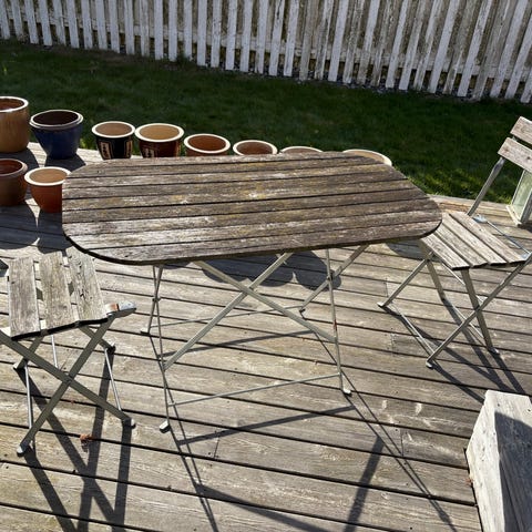 Havebord og klapstole sæt i træ i naturfarve. Sættet består af et firkantet bord og flere stole med lameller i sæde og bordplade. Velegnet til brug på terrasse, altan eller i have som udendørs spise- eller cafésæt. Træet fremstår ubehandlet på billederne og kan efter behov slibes og behandles efter købers ønske.