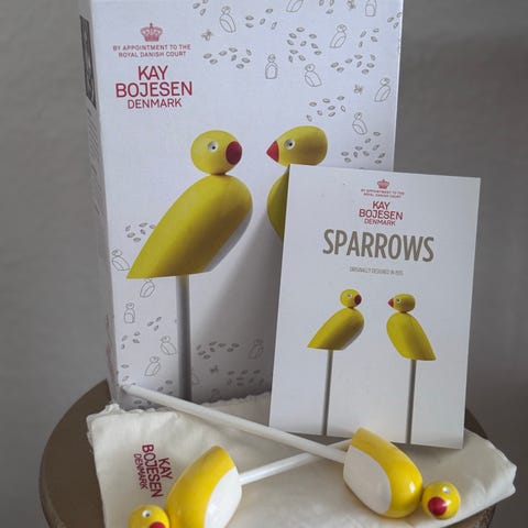 Kay Bojesen påskepinde i træ i gul farve. Sættet består af to dekorationspinde med fuglemotiv, velegnet som påskepynt i fx potteplanter eller dekorationer. Leveres med stofpose med Kay Bojesen-logo.