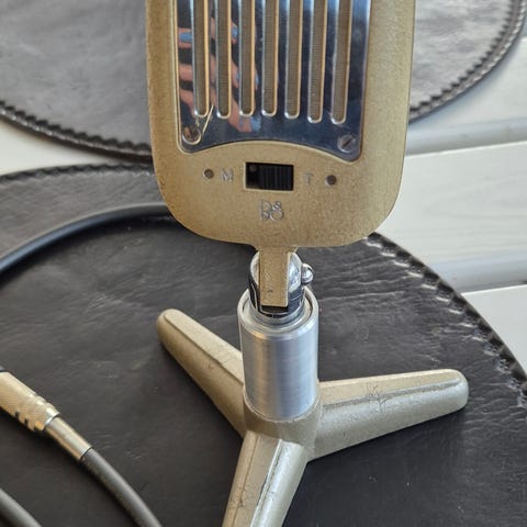 Vi har arvet denne Bang og Olufsen Belcanto mikrofon som er fra starten af 1960'erne.