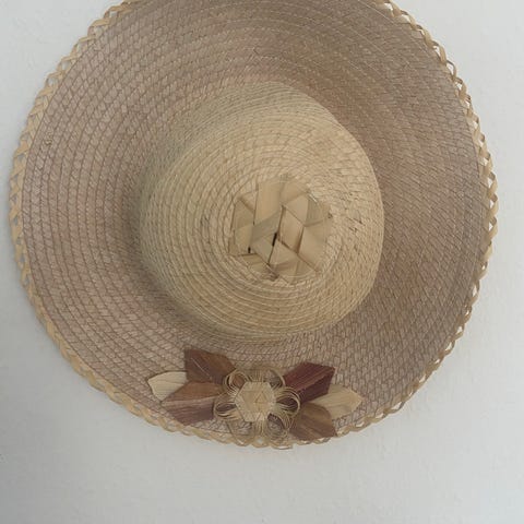 Stråhat i naturfarve lavet af flettet materiale. Hatten har en bred skygge og er dekoreret med en bastsløjfe rundt om kronen. Den er let og ånder godt, hvilket gør den ideel til solrige dage. Etiket med angivelse af 'SCAL' indeni.