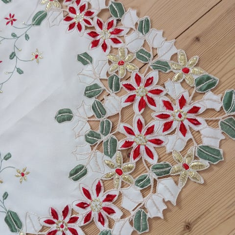 Langkilde og søn Juledug i hvid med broderet motiv langs midten. Dugen har klassiske julemotiver