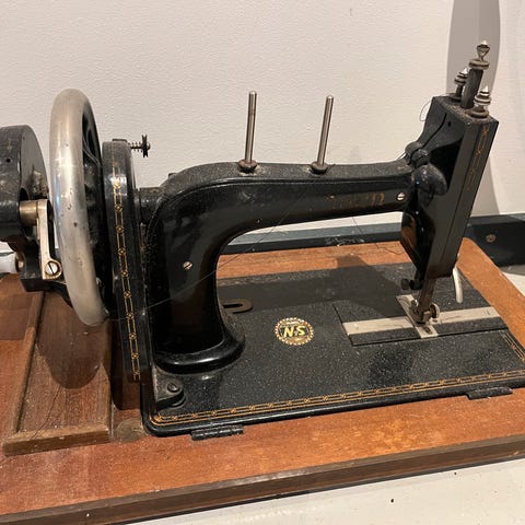Symaskine, To gamle symaskiner fra 30erne. De er begge hånddrevne. Den ene er fra Singer og med flotte malede detaljer langs kanten samt op af maskinen.