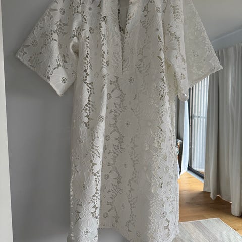 Dea Kudibal Phoebe kjole til særlige lejligheder i blå bomuld til kvinder i størrelse XS. Kjolen har et gennemgående broderet blonde- og hulmønster med blomsterdetaljer og er foret indvendigt for bedre komfort og dække. Modellen har kortere ærmer og rund halsudskæring med lille åbning foran. Materialet er bomuld ifølge mærket, og der er angivet maskinvask på skåneprogram samt mulighed for professionel rens. Velegnet til brug ved fester og andre særlige lejligheder.