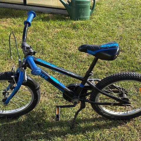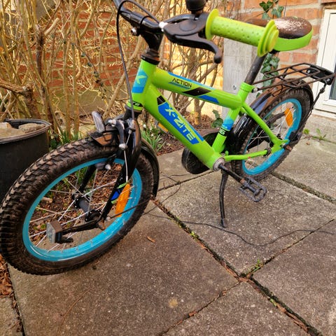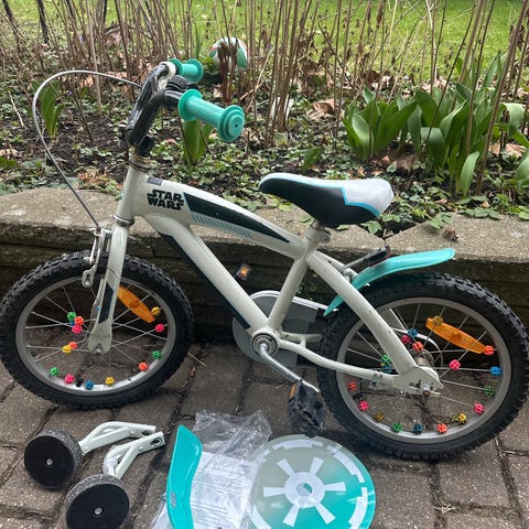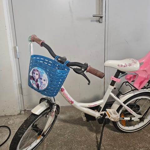 Super fin børnecykel med 16" hjul, star wars-tema, udstyret med kurv foran og bagagebærer bagpå. Fastsat baglygte. Cyklen har skridsikre håndtag og kædeskærm, egnet til børn der lige er startet med at cykle eller som den første cykel. Kører fint.