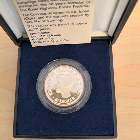 10 kr 1986 sølv i kapsel og etui. Kronprins Frederiks 18 års fødselsdag.