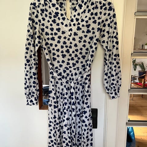 & Other Stories Paris Atelier hverdagskjole i str. 38. Kjolen er i viskose og har et multifarvet blomstermønster på mørk bund. Modellen har slå-om-effekt med bindebånd i taljen og lange ærmer med let puff og elastik ved håndleddene. Længden går cirka til under knæet/midiskørt. Velegnet som hverdagskjole til kvinder. Blåblomstret, Viskose, Næsten som ny, Pæn slåomkjole med lange ærmer. Brugt en gang og vasket en gang. Prisen er fast og køber betaler porto.