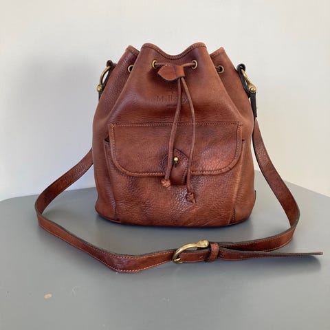 Meget smuk bucket bag/mulepose i mint condition. Tasken har været i brug ganske få gange - ellers har den blot ligget i sin dustbag og dufter stadigvæk af nyt læder. Indvendigt har den sort og lilla fór med logomønster og to lommer, hvoraf den ene kan lukkes med lynlås. Skulderremmen er justerbar. Dustbag og nøgleringstilbehør medfølger.