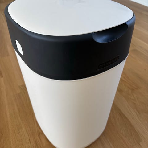 Tommee Tippee Twist & Click blespand i hvid plast med mørk kontrastkant. Blespanden er designet til brug med Twist & Click-refillkassetter, hvor bleerne drejes og forsegles enkeltvis i plast for at indkapsle lugt. Låget åbnes opad, og indvendigt ses holder til posekassette. Velegnet til brug på pusleplads eller i børneværelse til hygiejnisk bortskaffelse af bleer.