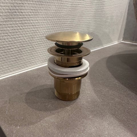 Vaskafløb med overløb i messinglook. Afløbet består af afløbshus med gevindtilslutning, prop med rund topplade samt pakninger. Der medfølger stang og beslag til betjening af proppen. Velegnet til håndvask med overløb, hvor der ønskes et messingfarvet afløb.