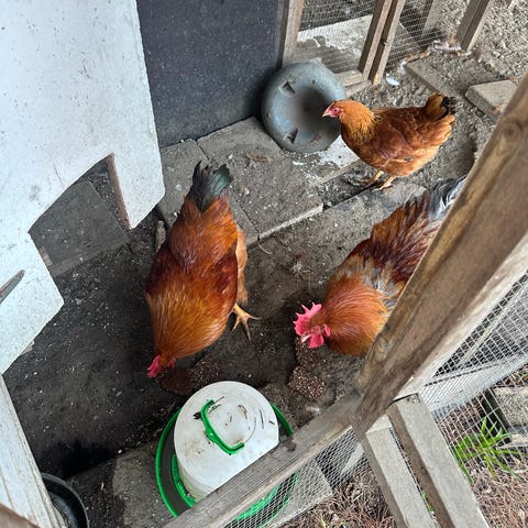 To flotte unge haner sælges, en rød (Isa Brown kryds) og en sort (Brahma/Orpington kryds)