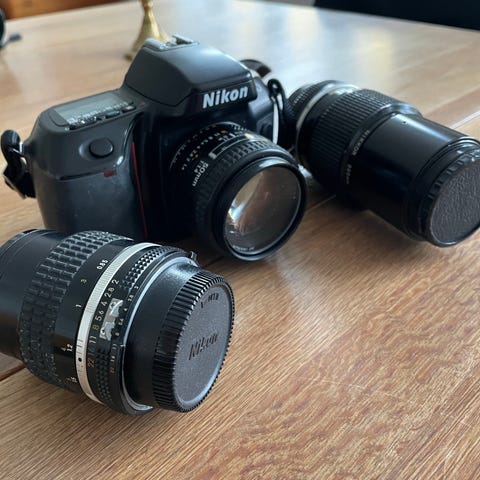 Nikon spejlreflekskamera med udskifteligt objektiv. Kameraet er et analogt SLR-kamera til 35 mm film med manuel indstilling af lukkertid og blænde via hjul og ring på objektivet. På toppen ses tilslutning til ekstern blitz via tilbehørssko. Der medfølger et Nikon-objektiv med frontdæksel samt en aftagelig kamerataske/bundtaske, som kan ses på billederne. Velegnet til fotografering på film og som mekanisk kamera til brugere, der ønsker manuel kontrol over eksponeringen.
