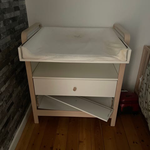 Jeg sælger puslebordet. Jeg købte det helt nyt fra Babysam for 2250 kr. Der er en plet som vist på billederne, men alt andet er i perfekt stand. Pletten kan poleres, og den vil blive fjernet. Målene for puslebordet er: 101 cm x 78,5 cm x 105 cm.