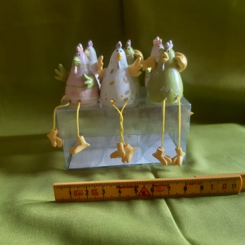 Påske figurer til lys i form af to haner. Figurerne er små og flerfarvede med malede mønstre i blandt andet rød, grøn, gul og sort. De står frit på en flad bund og egner sig som pynt til påskebord eller vindueskarm. Materialet fremstår som malet hårdt materiale, for eksempel gibs.