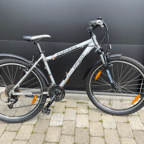 Kildemose intruder mtb med 26" hjul, Cyklen har brede dæk, afdæmpet forgaffel, 7 indv gear, skærme og ny saddel, lås m/ nøgle, støtteben, drikkeflaske holder, skivebremse på forhjul, bag bremse med klodser + bag bremse i pedaler, ny serviceret og klar til ny ejer