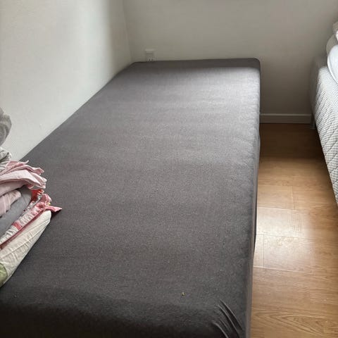 Briks - boksmadras - springmadras med forchromede ben. Koksgråt stof.