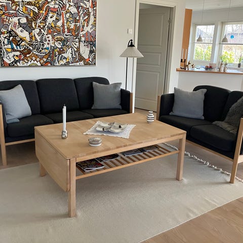 Særdeles velholdt 3-personers tremmesofa (Kragelund K 129, "Aya". Nypris: kr. 11.500,-). Stellet er i eg, og tekstilbetrækket er "852 - Mahoga, Seal Grey". Indkøbt i 2021 fra Anders Jensens Møbelhus i Roskilde (originalkvittering haves). Fra husstand (1 pers.) uden husdyr og røg.