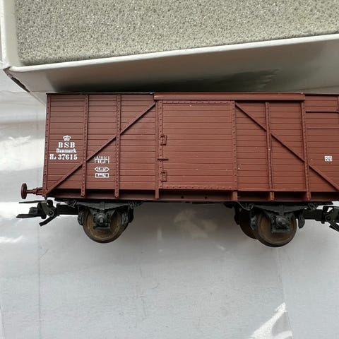 LASER DSB Litra Hios godsvogn modeltog i hvid farve. Godsvognen er udført som en DSB gods container-/kassevogn med brun undervogn og forskellige påtrykte vognnumre og tekniske data på siden. Leveres i original skumindlæg og æske mærket L.A.S.E.R. Egnet til modeljernbane og samling i HO med DC hjul