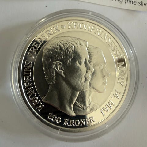 Den Kongelige Mønt 200-krone sølvmønt udgivet i anledning af Hendes Majestæt Dronning Margrethes 25-års regeringsjubilæum den 14. januar 1997.