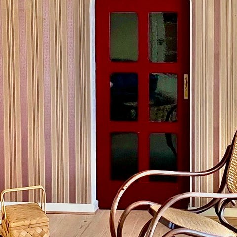 Indvendig dør med to glasfelter i hvidmalet træ. Der er monteret dørgreb og låsekasse, og der medfølger hængsler som vist på billederne.