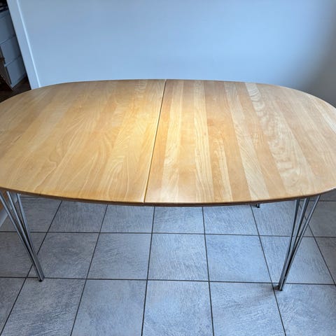 Spisebord udtræksbord i lyst træ med ovale ender og metalben. Bordet består af en bordplade i træ med synlige stave og afrundede hjørner. Det har udtræksfunktion med tillægsplader, som kan forlænge bordet, så der bliver plads til flere siddepladser. Benene er slanke og fremstillet i metal, hvilket giver et let udtryk og god stabilitet. Velegnet som spisebord i køkken eller spisestue.