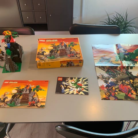 Lego 6023 Legoland riddervogn og tilhørende borgsæt. Indeholder riddervogn med hest og minifigurer samt større borgbygning på grøn baseplade med port, tårn, flag og trædetaljer. Der medfølger også et udvalg af skjolde, våben og små tilbehørsdele. Velegnet til leg og opbygning af middelalder- og riddermiljøer med Lego klodser.