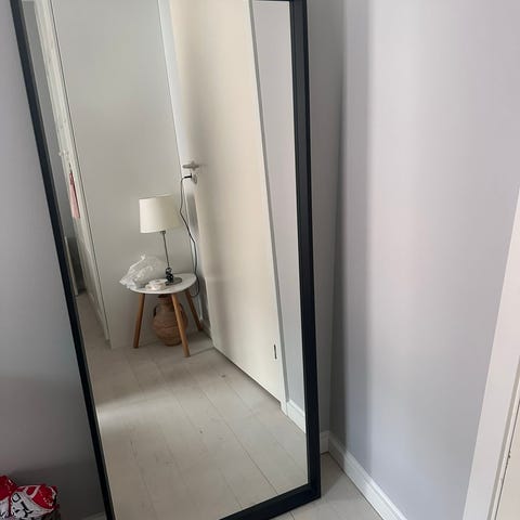 IKEA spejl i rektangulær form. Spejlet har en smal, mørk ramme og er velegnet til brug i entré, soveværelse eller gang. Kan også ophænges.