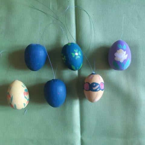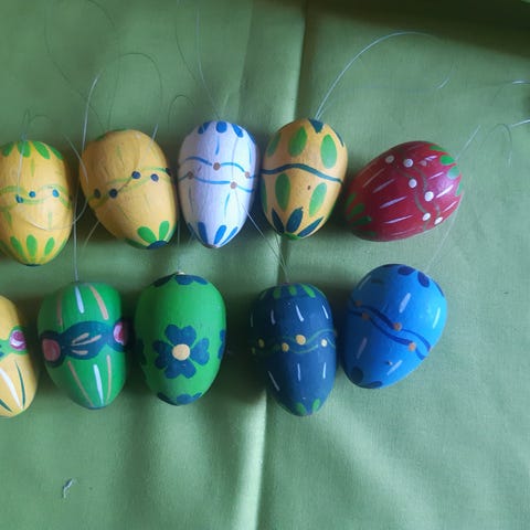 Håndmalede træ påskeæg sæt med 5 stk. Æggene er i forskellige farver og mønstre, blandt andet gule, blå og grønne nuancer med dekorative motiver. De egner sig som pynt til påske, for eksempel ophæng på grene, borddekoration eller vinduespynt.