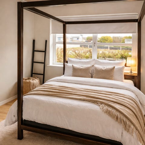 Himmelseng af delvis mørkbejdset træ. Bemalet himmel med blomsterranker og duer. H. 205, B. 182, D. 115. cm.