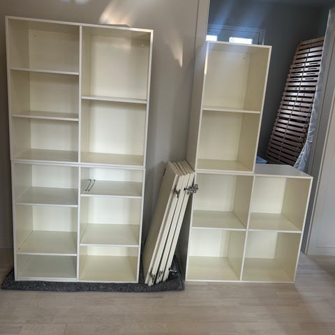 Haslev reolen - 6 reoler sælges kun samlet. 1 skuffe element. 2 elementer med låger. 3 åbne.
