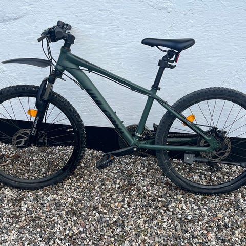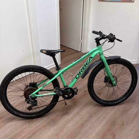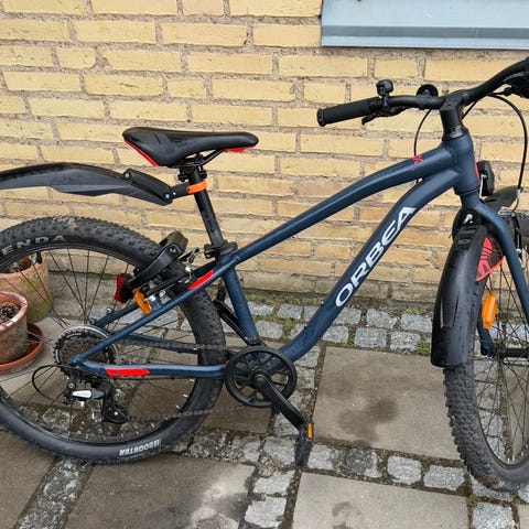 Orbea børnecykel med 24" hjul. Cyklen er en hardtail mountainbike-lignende model med lige styr og brede dæk, egnet til børn. Stellet er i blå farve med sorte og røde detaljer. Cyklen er udstyret med skærme for og bag samt reflekser på hjulene. Velegnet til både hverdagscykling og lettere terrænkørsel for større børn, der passer til 24" hjulstørrelse. Ny pris over 6000kr