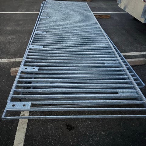Galvaniserede metalrækværk / hegnselementer i stål. Består af flere sektioner med lodrette tremmer og enkelte skråtstillede tremmer. Egnet til brug som afskærmning, gelænder eller hegn omkring fx trapper, terrasser eller arealer udendørs. Fremstillet i galvaniseret stål, som er velegnet til udendørs brug. Mål på de enkelte sektioner kan tages ved interesse.