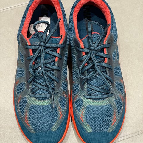 Ecco sneakers i str. 44. Modellen er en let og åndbar sneaker med mesh-overdel og syntetiske forstærkninger. Skoene er blå med lyse detaljer og har elastiske snørebånd med stoplås for nem justering. Ydersålen er lys og mønstret for bedre greb. Velegnet som hverdagssko eller til lette fritidsaktiviteter.