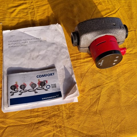Grundfos Alpha2 cirkulationspumpe til brug i varmeanlæg. Pumpen har automatisk regulering (AUTO-funktion) og energimærkning A. Velegnet til cirkulation af varmevand i centralvarmesystemer i boliger og mindre installationer. Tilslutning via gevindstudser i begge ender af pumpen.