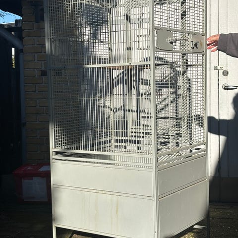 Stort og lækkert Lux bur fra Randers volieren med understel på hjul, led lys samt hø/drikke holder og helt ny drikke flaske.