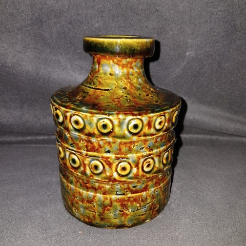 Lille fin vase fra Abbednæs keramik. I blå med røde hjerter og hvide dekorationsdetaljer. Diameter 11 cm, højde 7 cm.