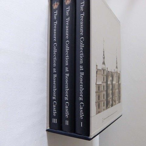 "The Treasure Collection at Rosenborg Castle" bogsæt bestående af 3 bind på engelsk. Værket gennemgår skatkammeret på Rosenborg Slot med fokus på kronregalier, juveler og kongelige genstande. Hårdt omslag med illustrerede forsider og mange farvefotografier af samlingens genstande. Velegnet som opslagsværk om Rosenborg Slots skatkammer og dansk kongelig kunsthåndværk.