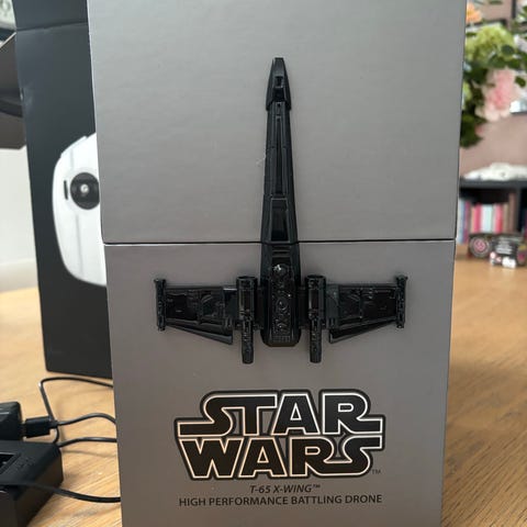 Star Wars X-Wing fjernstyret drone i hvid og rød. Modellen leveres i original emballage med illustration af X-Wing rumskibet og separat fjernbetjening. Dronen styres via medfølgende controller med to styrepinde og knapper på fronten. Egnet som legetøj eller samlerobjekt for Star Wars-interesserede. Yderligere tekniske specifikationer som rækkevidde, batteritype og funktioner fremgår af emballagen eller producentens oplysninger.